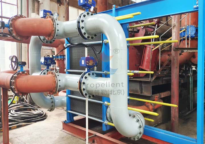 寬流道板式換熱器進行印染廢水余熱回收,將廢水中的熱量傳遞給工藝用水,節約能源,提高生產效率。
