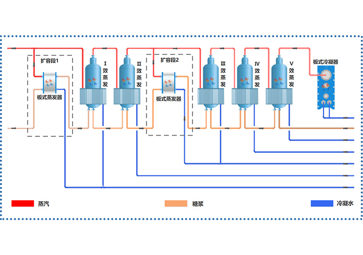 甜菜糖廠:原甜菜糖廠總榨量3350噸/天,糖漿錘度50BX。在Ⅲ效蒸發罐前采用擴展板式蒸發器工藝,錘度達65BX,蒸發量增加1t/h。
