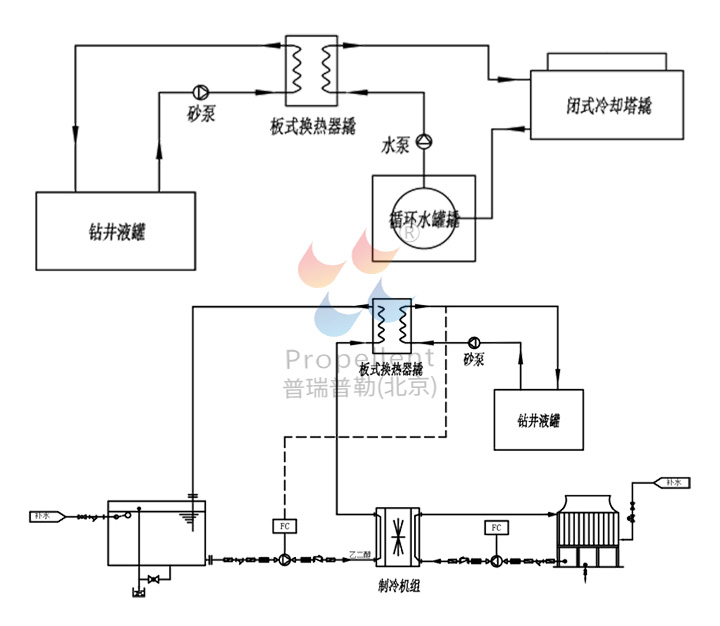 該系統(tǒng)提供兩種靈活的冷卻模式:一是通過空冷器利用自然風冷卻循環(huán)水,再與鉆井液進行熱交換;二是通過制冷機組制備冷凍水對鉆井液進行強制降溫。